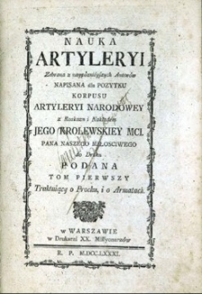 Zawiera 20 rys. Tom I traktuje o prochu i armatach. Dedykacja królowi Stanisławowi Augustowi.