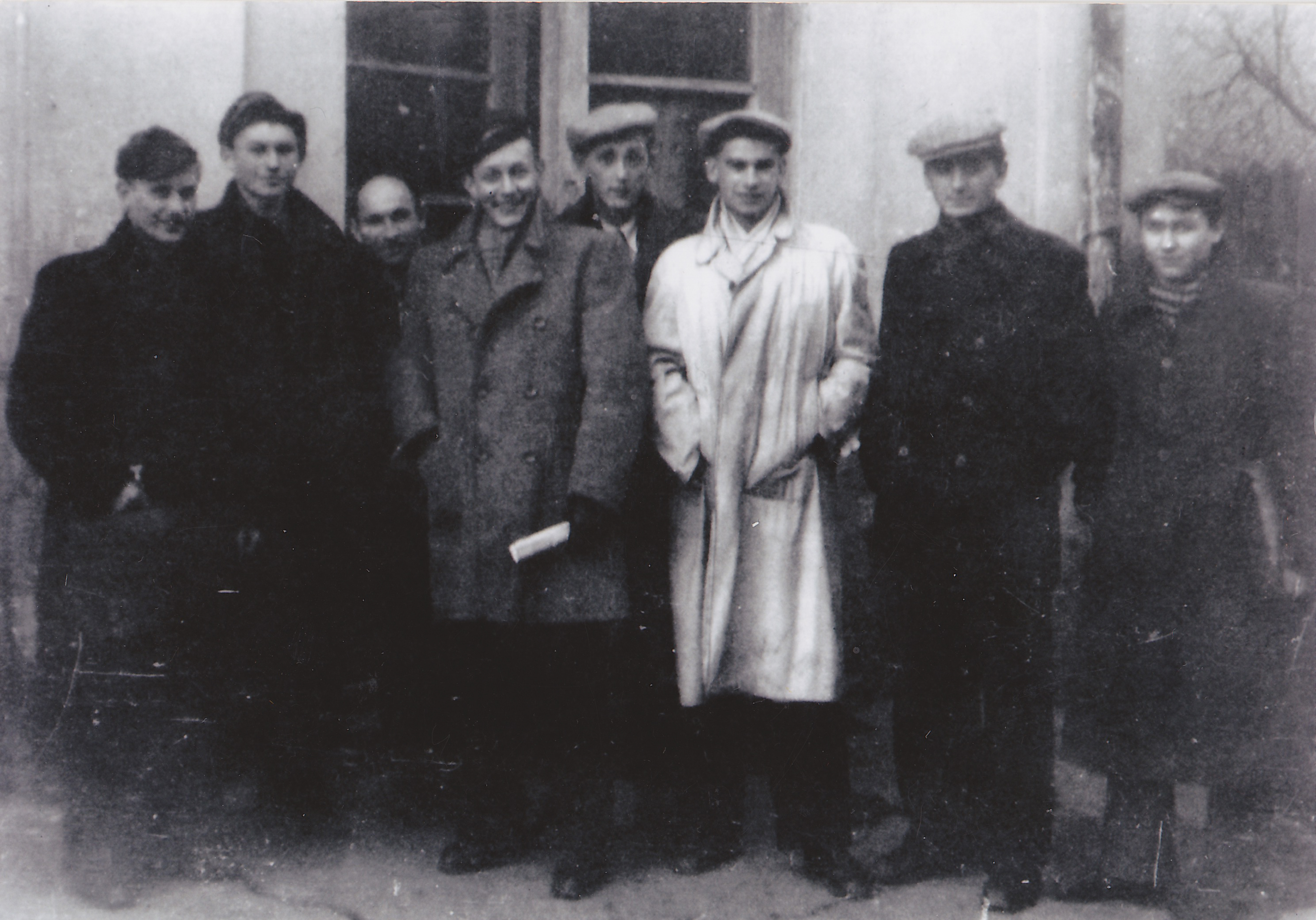 Członkowie Klubu Związkowiec na tle budynku klubowego, ul. Słonimska, Białystok, lata 50. XX w.