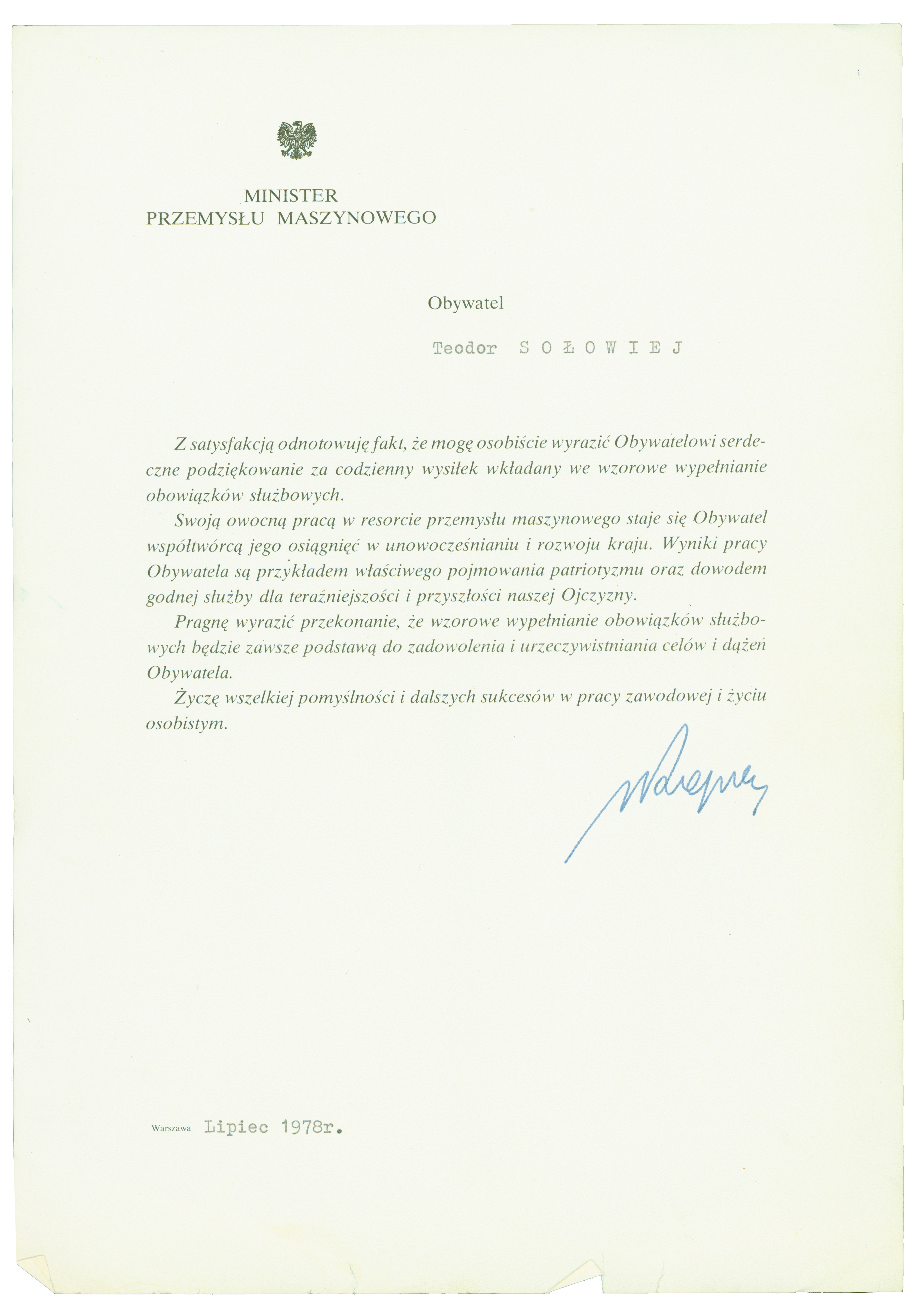 List pochwalny dla Teodora Sołowieja od Ministra Przemysłu Maszynowego, Warszawa, lipiec 1978 r.