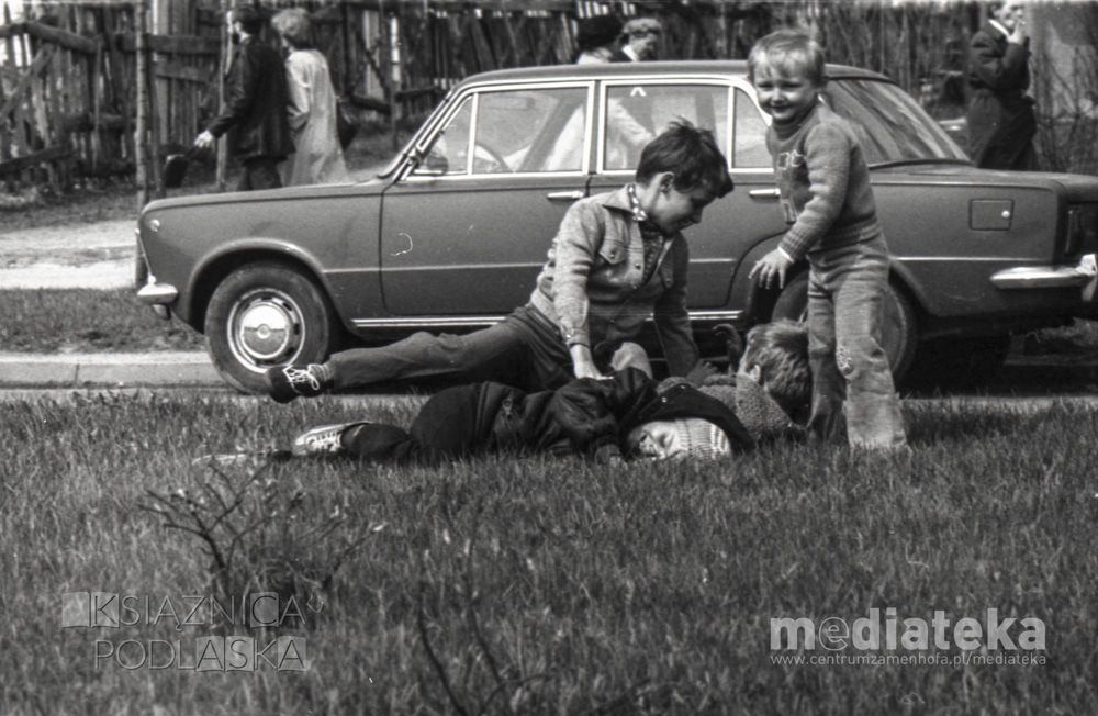 Dzieci bawiące się na trawniku, Białystok, ok. 1978 r., fot. ze zbiorów Andrzeja Trzcińskiego