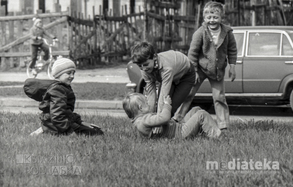 Dzieci bawiące się na trawniku, Białystok, ok. 1978 r., fot. ze zbiorów Andrzeja Trzcińskiego