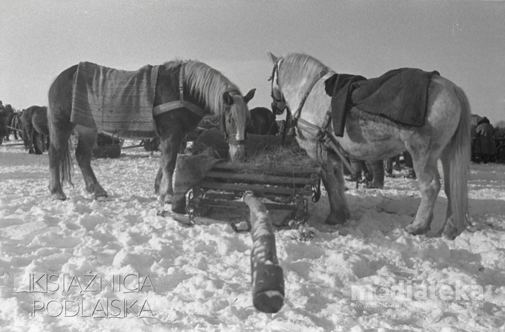 Portret koni przy paśniku, druga połowa lat 70. XX w., fot. ze zbiorów Andrzej Trzcińskiego