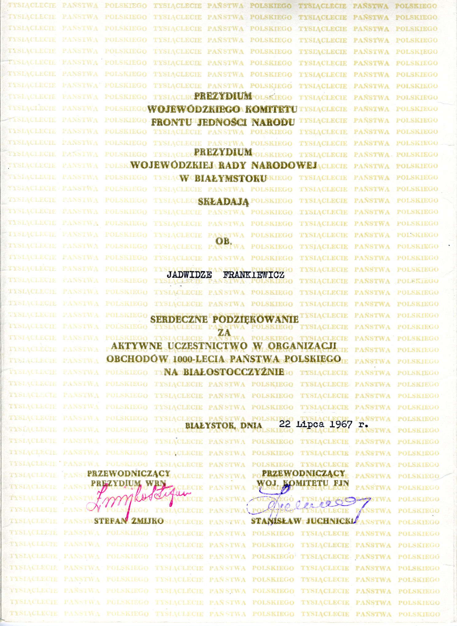 Podziękowanie dla Jadwigi Frankiewicz