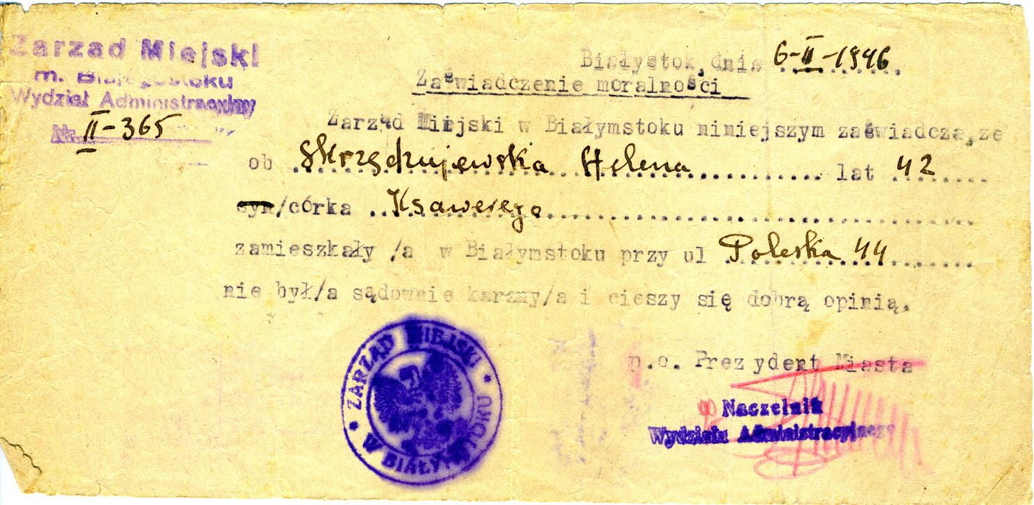 Zaświadczenie moralności Heleny Skrzędziejewskiej