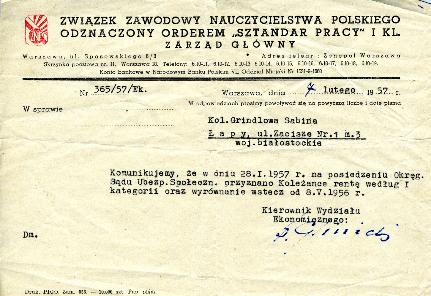 Pismo w sprawie przyznania renty Sabinie Grundl